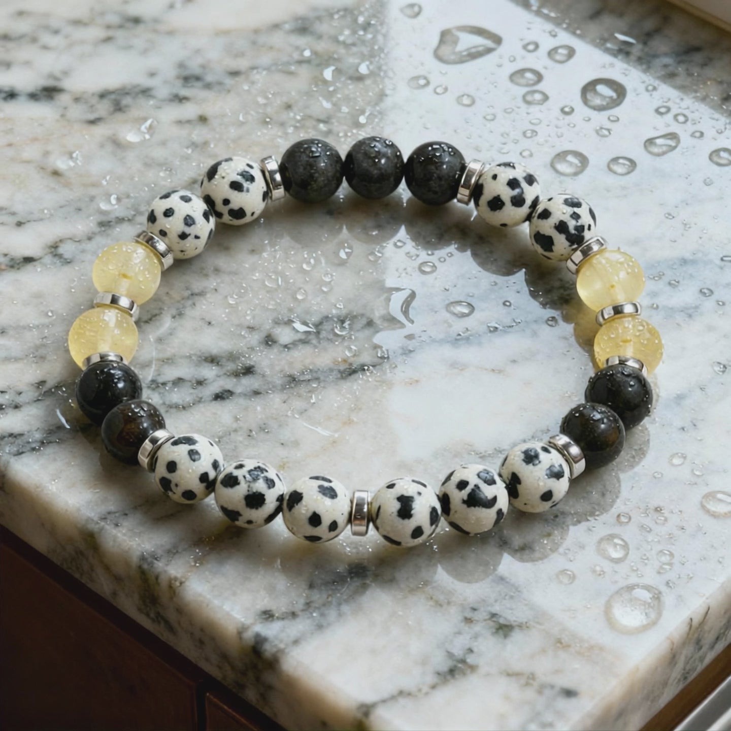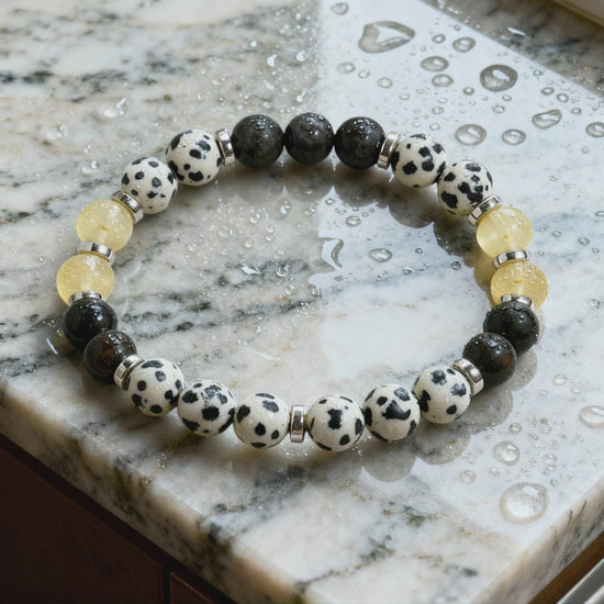 Bright Citrine sparks a clear, energized mindset while Dalmatian Jasper steadies your mood, with glowing Yooperlite accents adding a subtle, night-sky calm.