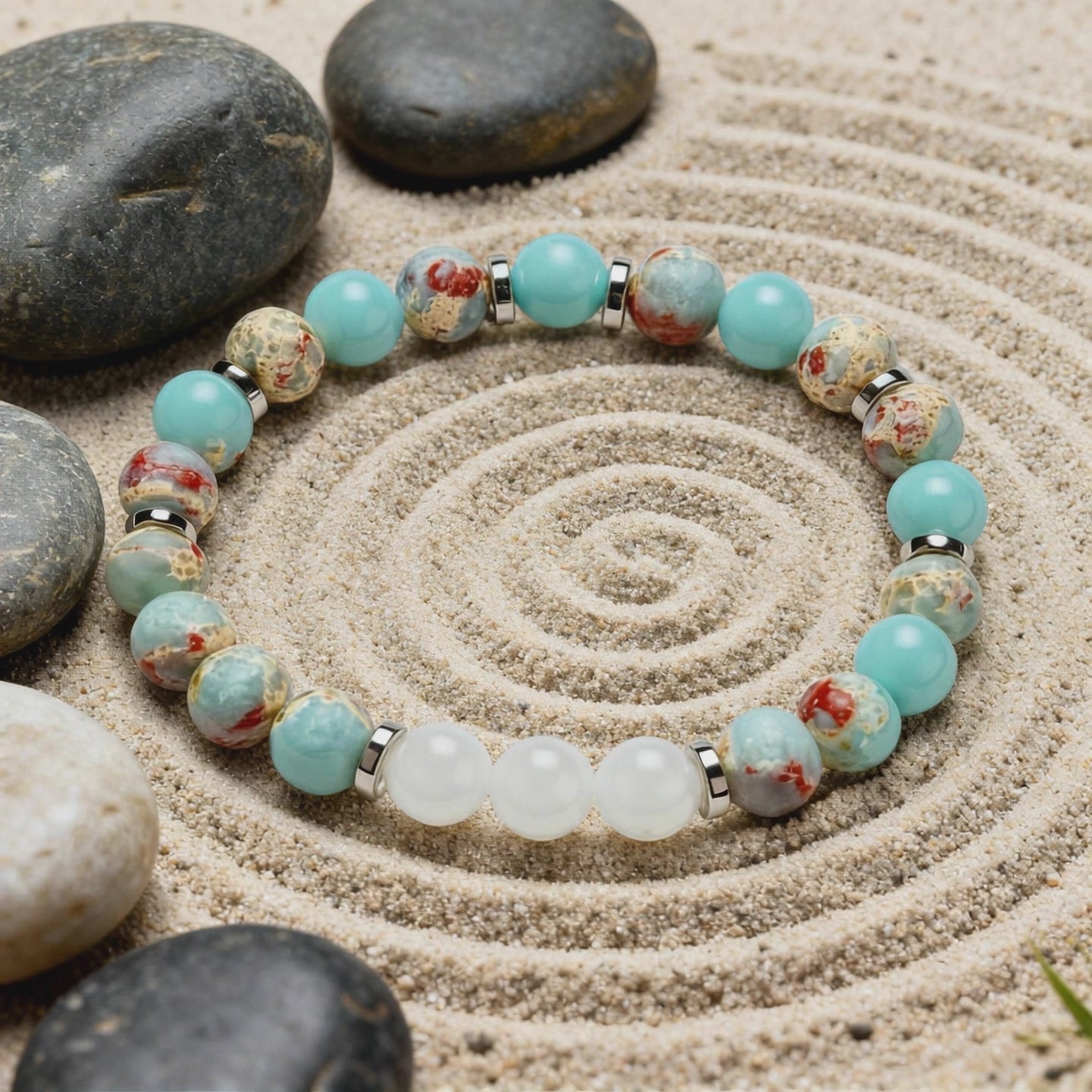 Settle into a centered state with earthy Aqua Terra Jasper balanced by the crisp clarity of White Jade, a duo crafted to steady your mood and soften the day’s edges.