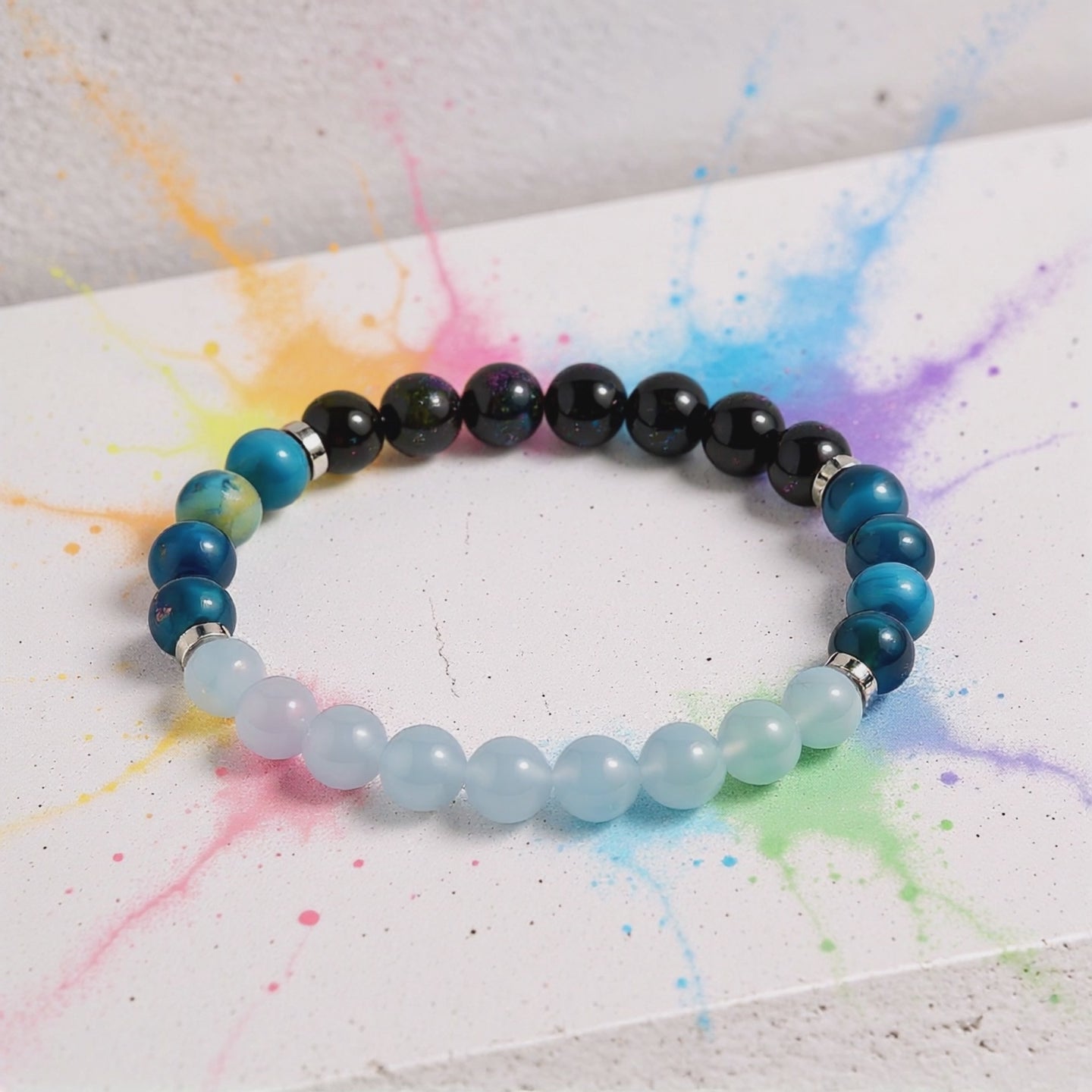 Elevate concentration and inner calm with the 'Deep Focus' bracelet, featuring the tranquil energy of Blue Chalcedony and the stabilizing strength of Obsidian, accented by Royal Blue Tiger's Eye.