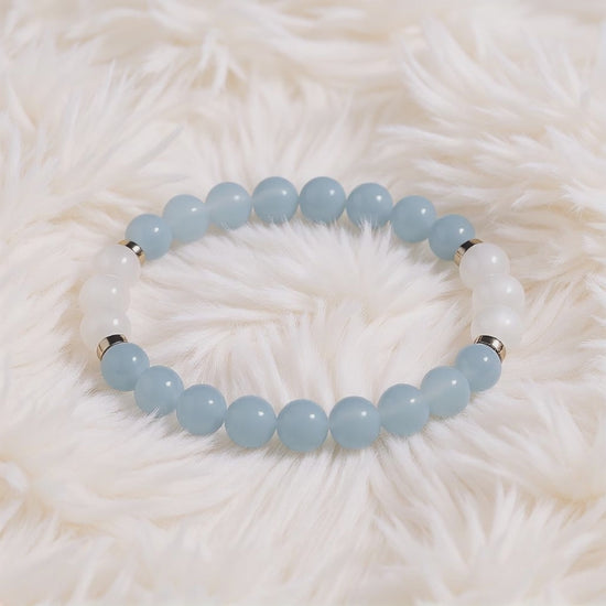 Let the peaceful blend of Blue Chalcedony and Selenite in the 'Tranquil Light' bracelet bring a sense of gentle relaxation and clear, balanced energy to your day.