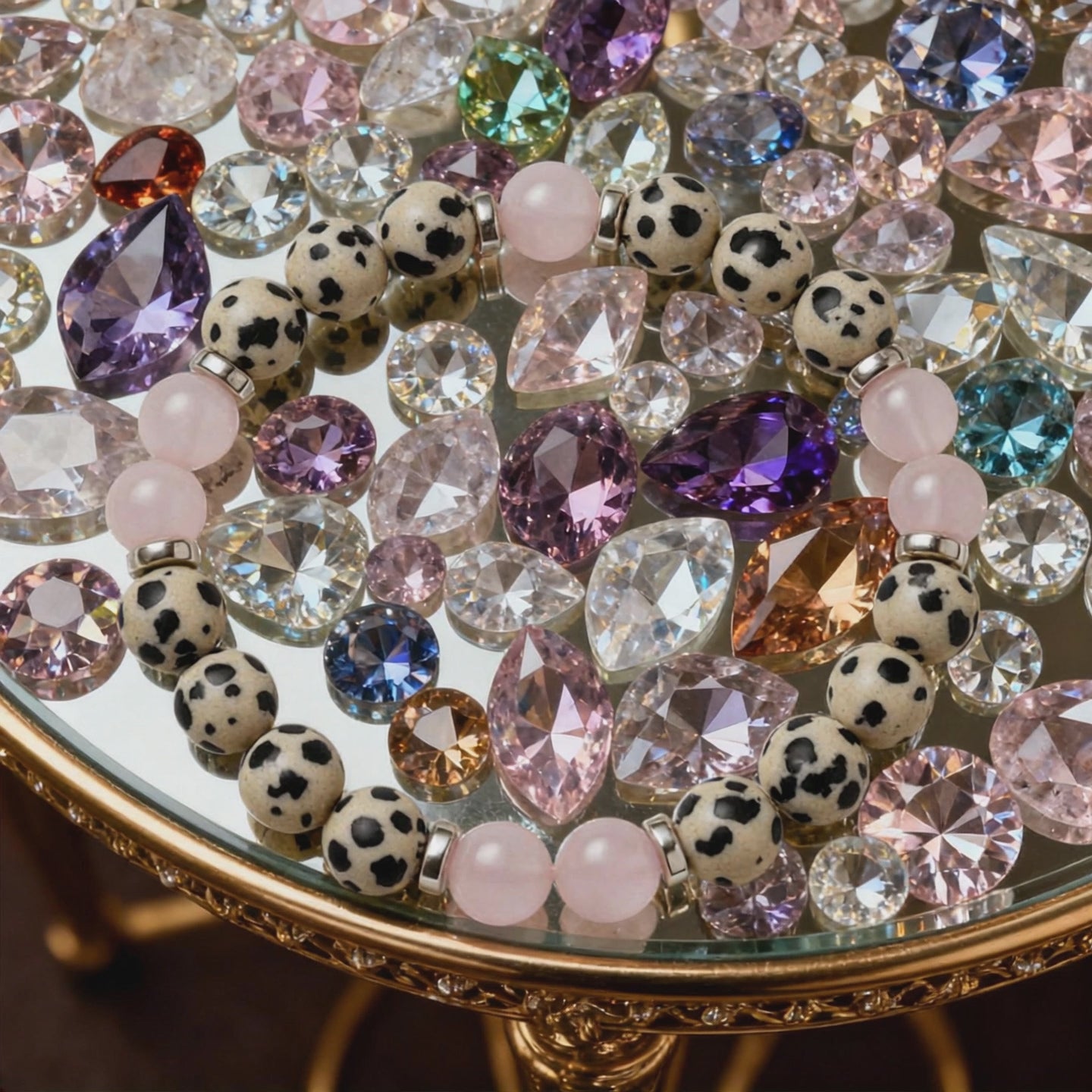 Find lighthearted ease with Dalmatian Jasper’s uplifting speckles paired with the soothing, heart-softening touch of Rose Quartz. A gentle daily companion for calm with a hint of joy.